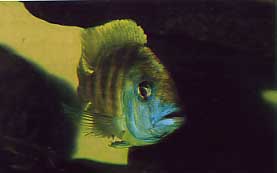 I Nimbochromis sono voraci predatori di piccoli pesci, come dimostra la dentatura faringea composta da elementi bicuspidi ben spaziati, con la punta maggiore rivolta in avanti. La specie N. venustus non fa eccezione: è tra le più grandi del genere e raggiunge la lunghezza standard di 185 mm, sebbene la letteratura riporti esemplari anche di 250 mm. Si rinviene comunemente in tutto il lago, nelle zone sabbiose poco profonde ( 10- 18 m ) caratterizzate da dense praterie di Vallisneria. Similmente alla maggior parte dei ciclidi del Malawi il cromodimorfismo è molto accentuato, le femmine e i maschi immaturi presentando una livrea molto simile: su una colorazione di fondo che varia dal sabbia all'argento si osservano disegni marroni scuro che ricordano delle losanghe. Nei maschi adulti e dominanti tuttavia i fianchi si scuriscono, mascherando il pattern originario, risultando di colore uniforme tendente all'ocra o ad un giallo piuttosto spento. La testa con la regione opercolare diviene di un blu molto intenso su cui spicca una banda impari longitudinale giallo dorato che parte dalla fronte attraversando la pinna dorsale per terminare a livello del peduncolo caudale. La descrizione ma più che altro l'osservazione dei maschi nel loro massimo splendore avallano l'impressione che ne ebbe Boulenger (primo autore a descrivere la specie), confermata del resto dalla scelta del nome specifico (dal lat. Venustus = elegante), e compensano chi, come me, non ha resistito alla bellezza di questo ciclide sfidandone la mole non indifferente. L'allevamento in acquario di N. venustus è piuttosto semplice purch é si rispettino poche regole elementari che ne garantiscano il fabbisogno delle esigenze primarie. Per prima cosa, date le dimensioni, il ciclide in questione ha bisogno di molto spazio per cui è consigliata una vasca non al di sotto del metro e settanta per permettere di allevare almeno due maschi che possano risultare dominanti. Sono poi validi i consigli generici per l'allevamento della maggior parte degli incubatori materni del lago Malawi: ogni maschio dovrebbe "disporre" di due o meglio, tre femmine perch é non manifesti la propria aggressività su un singolo individuo. E' opportuno che il gruppetto sia tenuto in vasche di comunità per diminuire l'aggressività intraspecifica: personalmente ho allevato N. venustus sempre in compagnia del congenerico N. livingstonii ottenendo buoni risultati in termini di compatibilita sia intra- che interspecifica. Altre specie citate dalla letteratura come buoni coinquilini sono gli altri rappresentanti del genere ( in tutto sette), ma anche molti Pseudotropheus e Labeotropheus. Come già detto questa specie preda altri suoi simili, per cui è bene porre attenzione alla taglia anche dei suddetti pesci nel momento dell'immissione nell'acquario: ricordo la malaugurata "idea" di un maschio di Haplochromis ismaheli, di ben sette cm !, di saltare nella vasca dei Nimbochromis dalla sua che le era stata provvisoriamente affiancata; neanche il tempo di prendere un retino per cercare un disperato recupero che già una coda spuntava dalle fauci di un maschio di 18 cm. La mia passione per questo pesce, che in realtà abbraccia tutto il genere, è nata nel 1994 quando dsono entrato in possesso dell'Atlante dei pesci d'acqua dolce da acquario del Dr. Axelrod: all'inizio della sezione dei ciclidi africani c' è una foto di uno splendido N. venustus maschio. L'incontro è stato folgorante e da allora ho cominciato a pensare una vasca che potesse ospitare il mio prediletto; cominciai con un duecentosettanta litri per poi arrivare agli attuali quasi quattrocento con una superficie di fondo'di 170x50. Nonostante l'habitat di origine riveli la preferenza del venustus per distese sabbiose, l'arredamento della vasca sarà costituito prevalentemente da substrato roccioso, costituente molti anfratti e disposto in modo che delimiti più territori del numero dei maschi dominanti. Le rocce comunque non dovrebbero superare una certa altezza per permettere che gli individui sfruttino appieno le dimensioni dell'acquario stazionando a mezz'acqua.