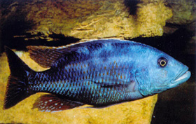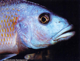 Arystochromis christyi. La colorazione delle femmine e dei giovani è particolare: un color bruno scuro con marezzature di bruno più chiaro, senza piccoli puntini come quelli del N. polystigma, le femmine con I1 età tendono a diventare poco a poco di un color bruno scuro uniforme. Le marezzature sono bianche in certi maschi adulti, ma possono essere assenti in altri. I maschi adulti sono veramente maestosi con la loro colorazione blu metallizzato, la loro pinna anale è piena di piccoli punti blu simili ad ocelli (ma le uova del 'fusco' non sono blu, dunque a cosa servono queste macchie?), la caudale e la parte molle della dorsale sono blu, rigate di rosso-arancione, il resto della dorsale (la parte spinosa) è blu con un bordo bianco. La base delle pinne ventrali è blu, il primo raggio è bianco ed il resto arancione; le pettorali sono incolori. Per concludere con la descrizione, é presente un piccolo punto arancione alla base di ogni scaglia e certi maschi hanno una colorazione verde nella parte inferiore della testa. Lo si ritrova al sud ed all'est del lago e anche nel lago Malombe. Può convivere con altri ciclidi accuratamente scelti. E così Michaél lo tiene insieme con Aristochromis christyi, Placidochromis milomo, Chilotilapia rhoadesii, Dimidiochromis compressìceps e Nimbochromis Unni e questi pesci sono anche un poco troppo calmi per il "fusco", che può essere un vero tiranno in certe vasche, e quindi in genere in acquario è il pesce dominante. La coabitazione con gli M'buna non da problemi, il "fusco" si incarica di limitare il numero di sopravvissuti delle loro riproduzioni. L'acquario necessita di qualche nascondiglio roccioso, ma deve esserci un ampio spazio di nuoto. La dimensione della vasca? la più grande possibile!, 500 litri sono il minimo. Il "fusco" non apprezza i nitrati, dunque bisogna assicurargli dei cambi d'acqua piuttosto regolari. Come ovvio il filtraggio deve essere abbondante ed il pH alcalino. Nella regione d'Eauze (regione dell' Armagnac) I' acqua è di durezza media (IH. di 20°f) ed il pH di 7.2 facilmente sale ad 8 col movimento intenso dell' acqua ed è ottimale per il nostro. L' alimentazione deve essere varia al fine di evitare carenze: pastone a base di spinaci, nasello, cozze, carote, piselli e gamberetti, le scaglie, il granulato. Non dimentichiamo di far osservare, ogni tanto, un giorno di digiuno in quanto, avendo un forte appetito, rischia l'obesità che oltre ad essere antiestetica può dare problemi intestinali. A partire dalla taglia di 14 cm, le femmine accettano le avances dei maschi che allora intensificano i colori! Spesso dopo un cambio d'acqua il maschio dispiega tutte le sue pinne e le corteggia fieramente. I maschi cominciano a colorarsi a partire dagli 8 cm.