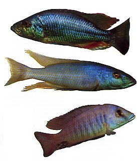In alto: D. strigatus. Al centro: Champsochromis caeruleus è un grosso predatore ma può convivere nella stessa vasca con D. strigatus. In basso: questo Otopharynx sp. è una specie importata recentemente dallaTanzania con il nome commerciale "Maravichromis three spots". Nonostante la qualità delle foto non sia ottima, è comunque possibile apprezzare la bellissima livrea di questi Ciclidi. |